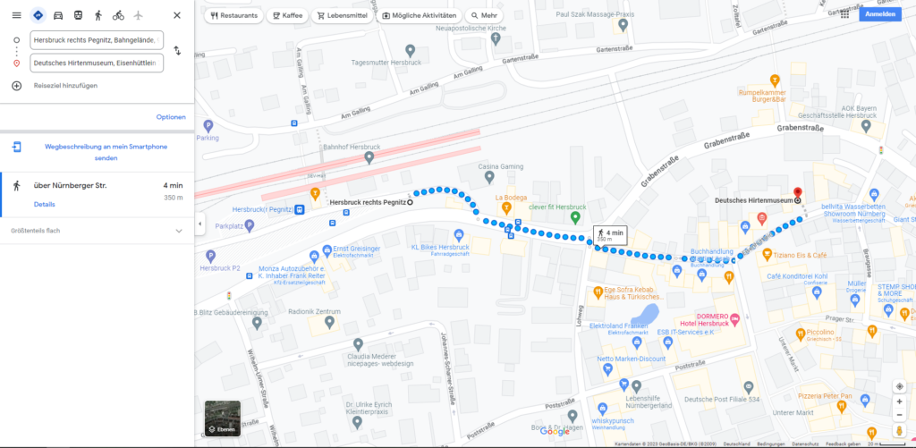 Am Bahnhof Hersbruck rechts d. Pegnitz gibt es kostenpflichtige Parkplätze. Das Tagesticket fürs Parken kostet 1,50 €. Der Bahnhof ist ca. 5 Minuten Fußweg vom Hirtenmuseum entfernt. Teil des Fußwegs ist ein kleiner Hügel.